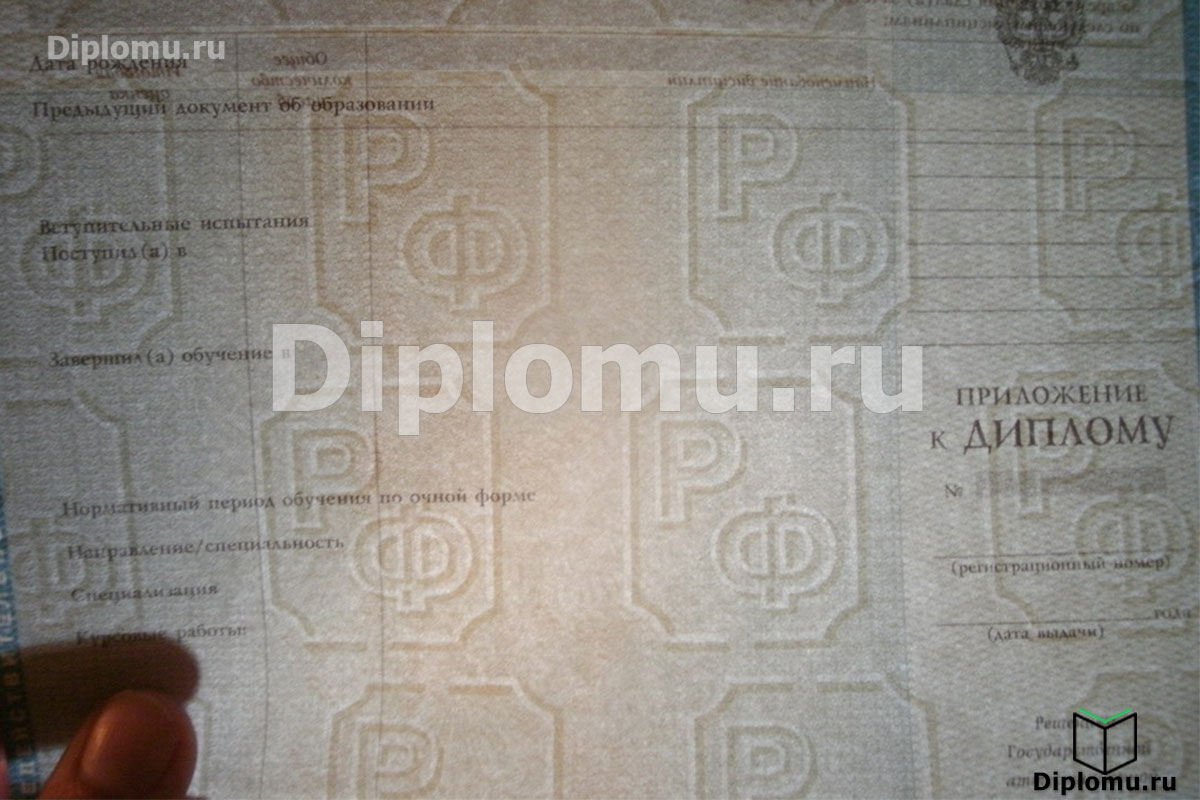 Водяные знаки на дипломах и аттестатах образуют собой видимое на просвет изображение букв «РФ», которые есть как на самом бланке, так и на приложении к нему. Покрывают всю поверхность бумаги. На фото №1 — водяные знаки на новом бланке Гознак, фото №2 — на бланке до 2013 года, фото №3 — на приложении до 2013 года (кликните для увеличения). |